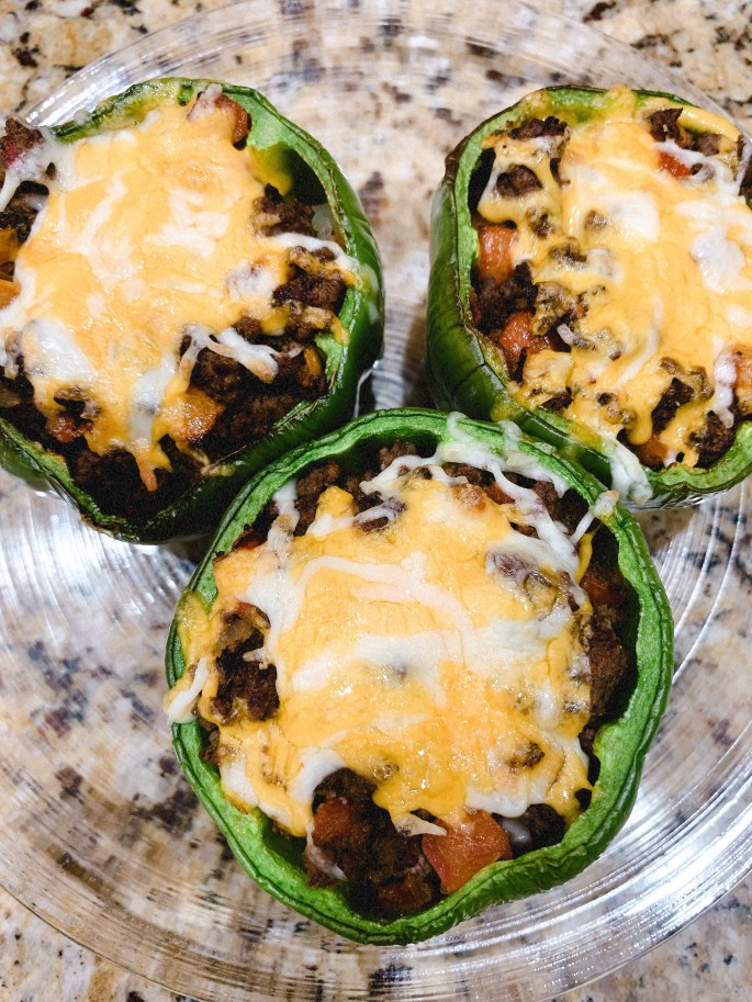 - When peppers are done, add 1 tablespoon of shredded cheese to the bottom of each pepper. Then spoon in beef mixture until almost full, leaving a little room at the top.