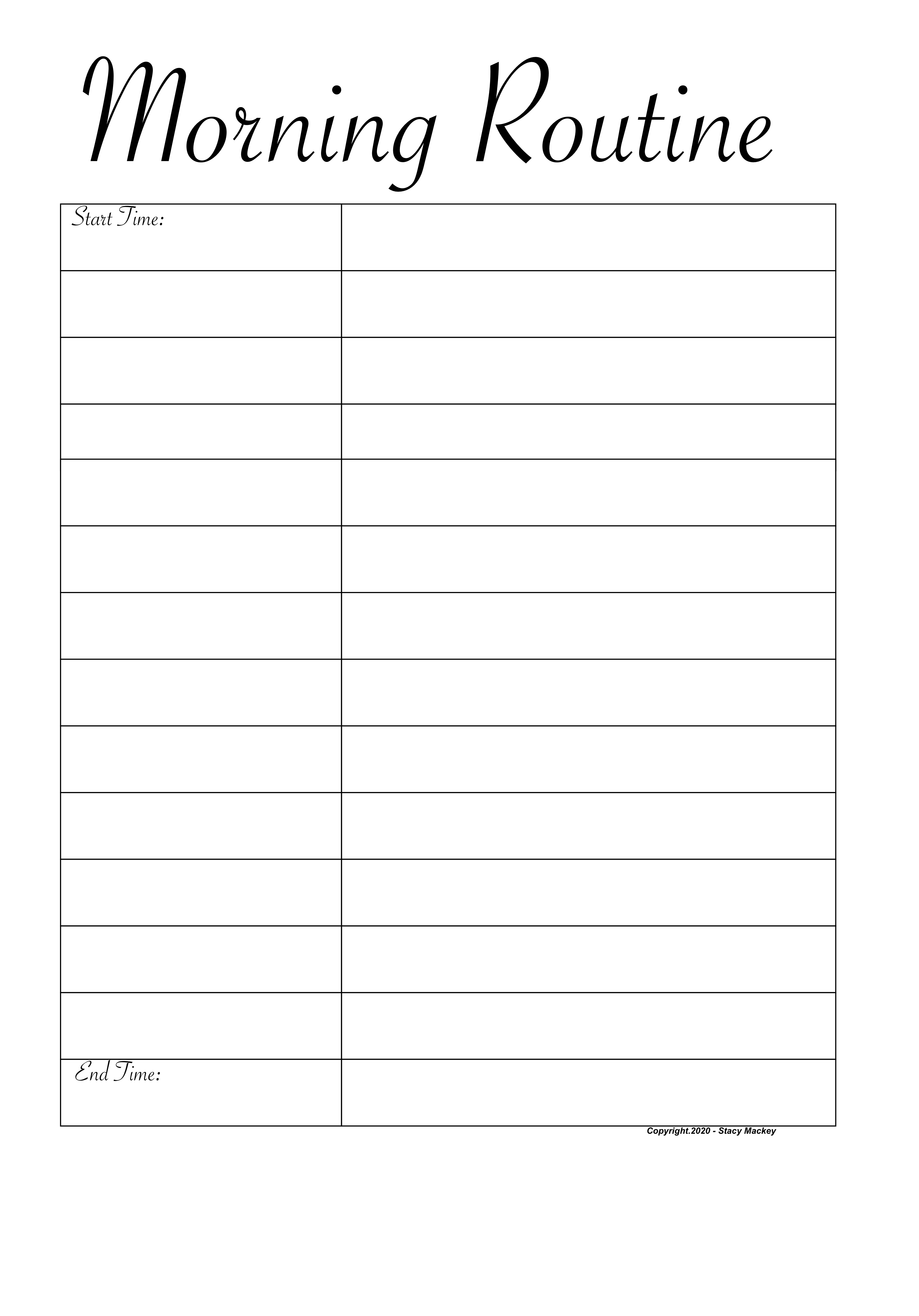 You will actually start at the bottom and work your way backwards. You start with what time you have to end your morning routine…let’s say you need to be out the door by 8:30 am. Then above that, list the things you would like to do during this time. For me, that’s things like meditate, read a few pages of a book, listen to a podcast or Audible, work out, shower/get ready for work….you get the point. Then to the left of each item, write how long this takes. My meditation is 5 minutes, workout is 30 minutes, etc. Then you can back into what time you need to start.