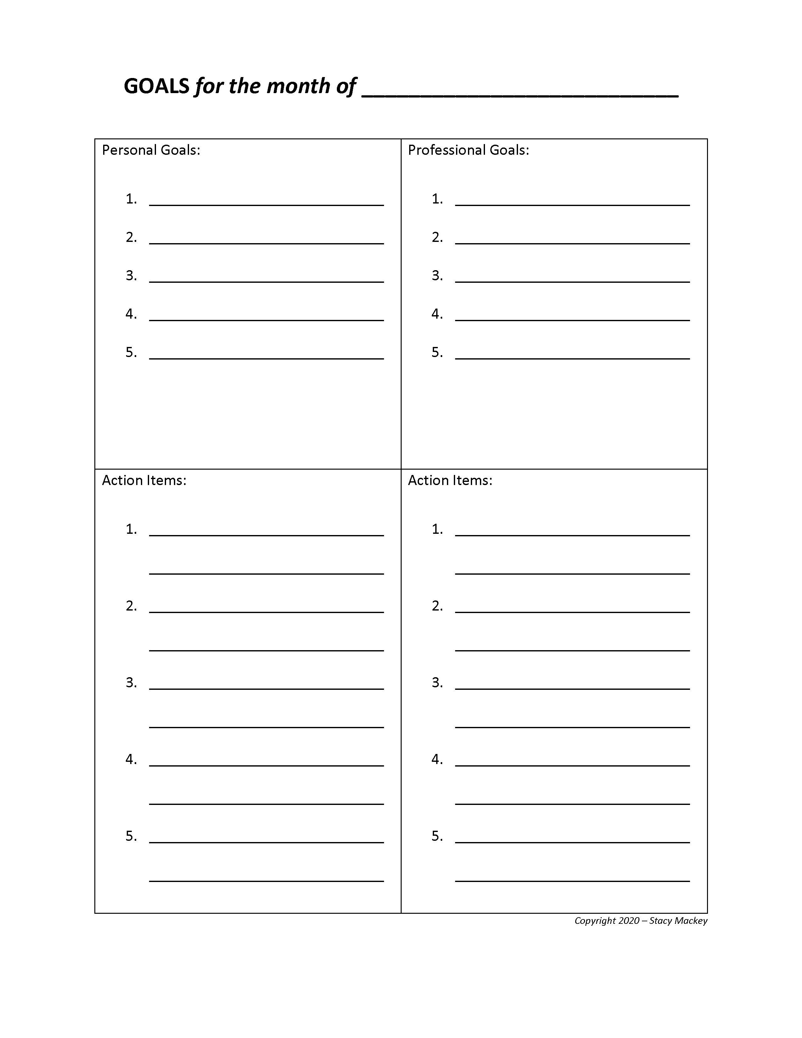 - In the lower boxes labeled, “ACTION ITEMS”, break down the steps you need to do to make those goals happen.