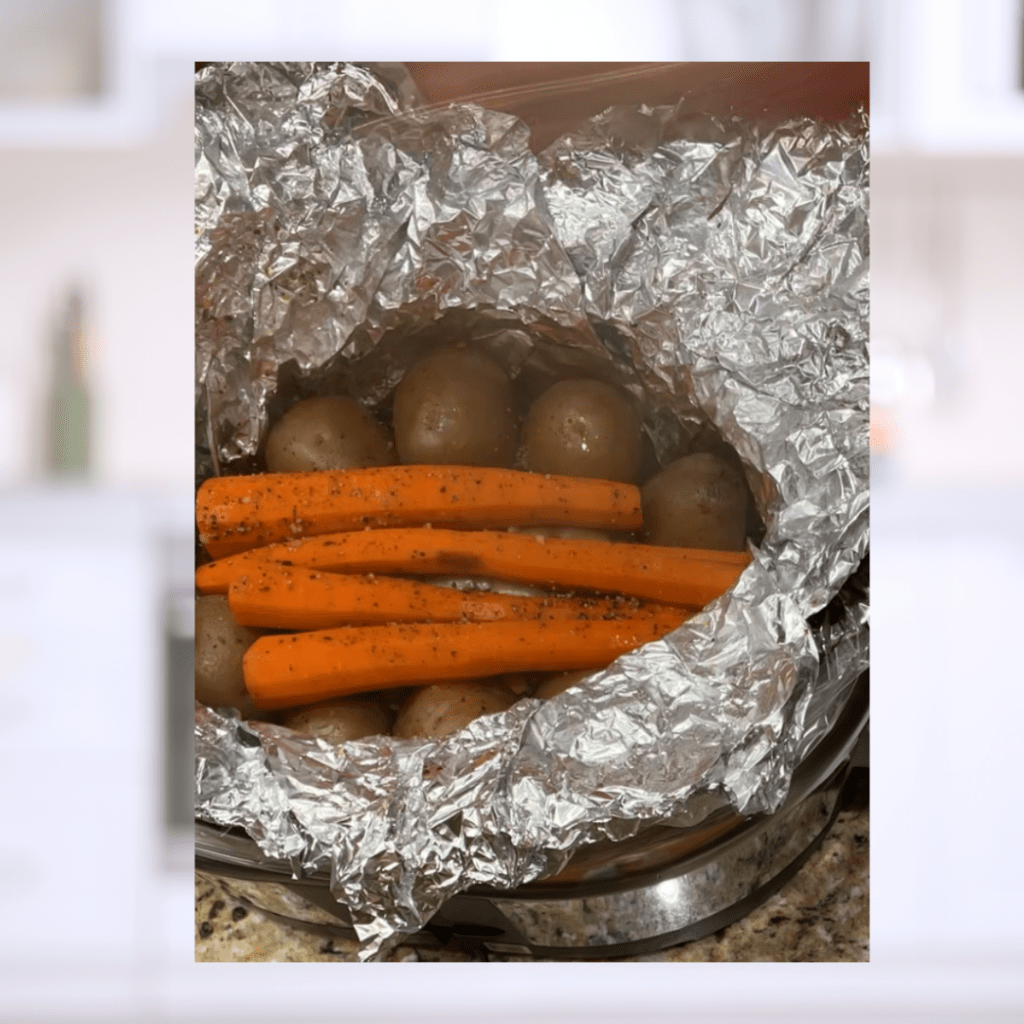 - Set up slow cooker and insert liner, then line with foil so that you can wrap everything up. (I create an “X” long enough to join the 2 pieces at the top.)