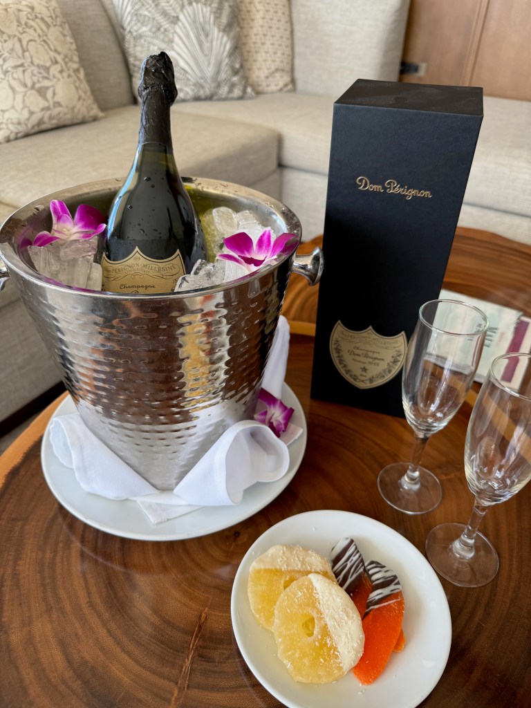 We stayed at the Fairmont Kea Lani – which was phenomenal! As a special anniversary gift, they upgraded our room to the Kilohana Corner Suite and sent up a chilled bottle of Dom Pérignon. CHEERS! 🥂